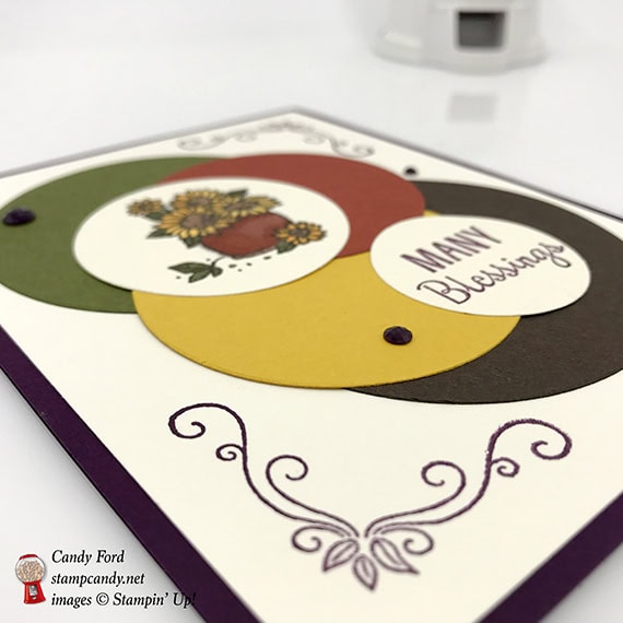 It’s time for the ICS Blog Hop for October. The theme this month is “Fall for All.” For today’s project, I used the Many Blessings stamp set, Layering Circles Framelits Dies, and several Autumnal colors. Three Blackberry Bliss Faceted Dots add the last little touch.