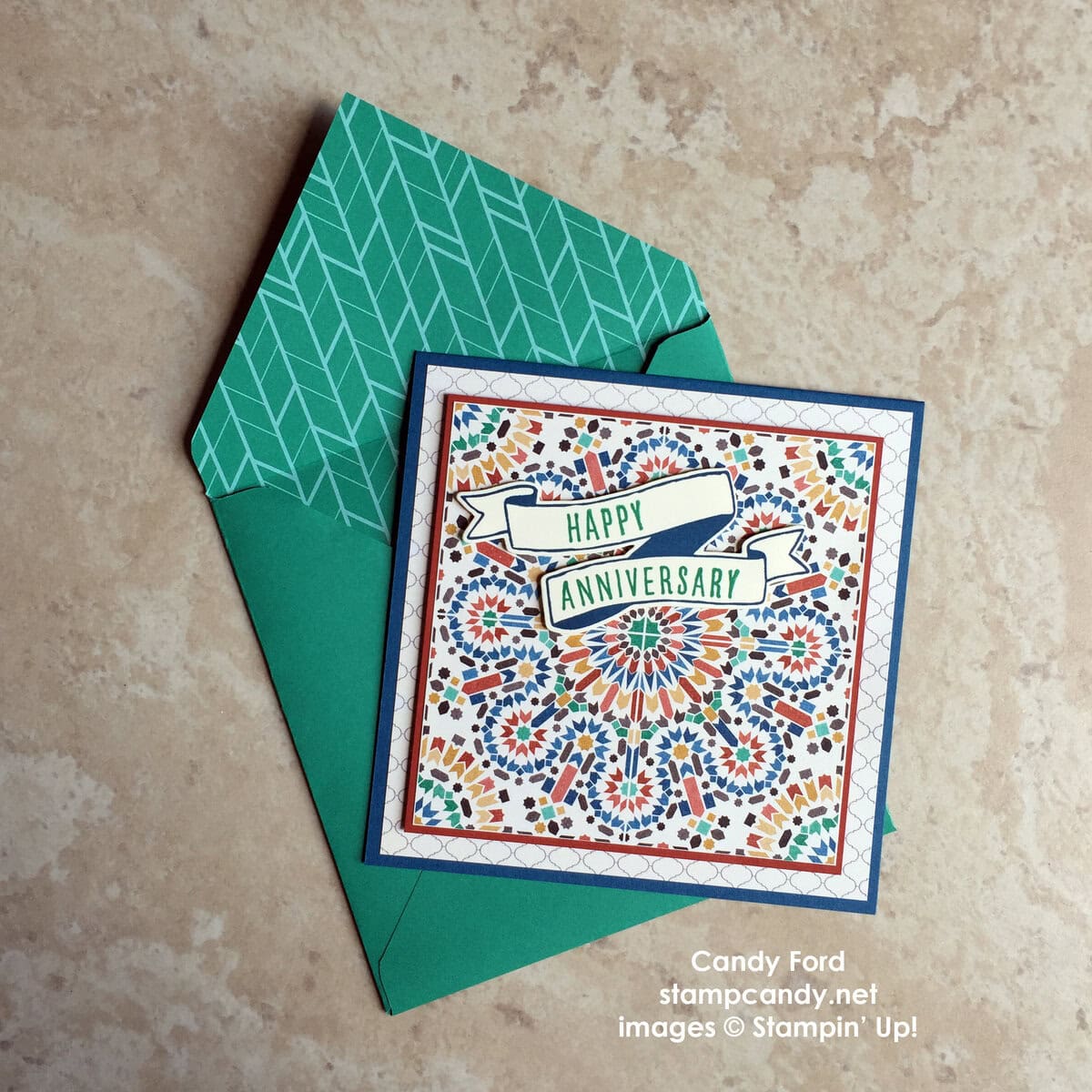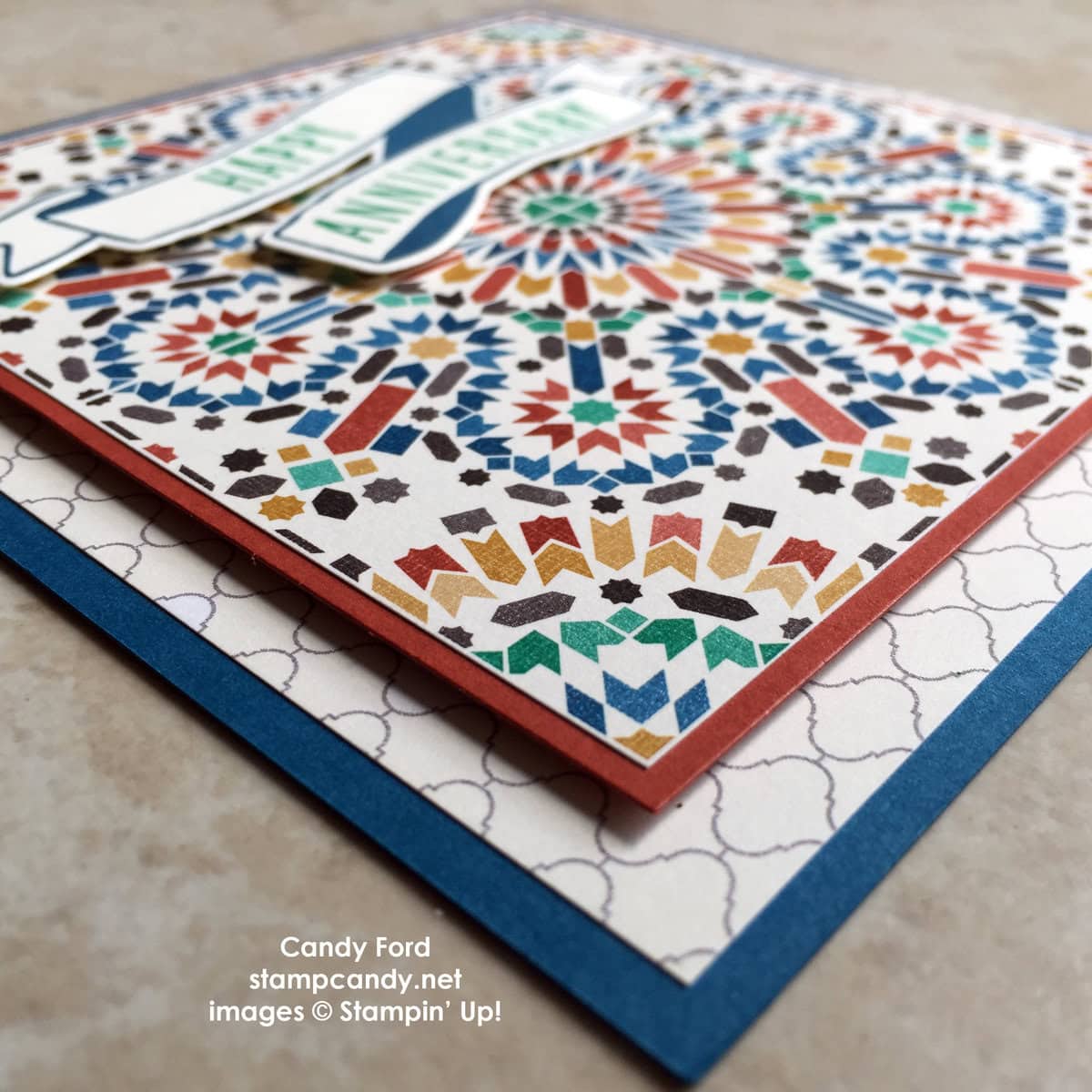 The Moroccan suite of products on pages 66-67 of the 2016-2017 Annual catalog is gorgeous! It includes a stamp set, Designer Series Paper, and Washi Tape. I was sold as soon as I saw the colors and designs of the DSP, especially the piece I used on today’s card. My husband and I would certainly love to receive an anniversary card like this. 25 years on October 12!