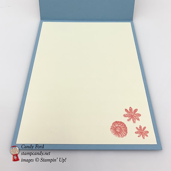 - three little flowers in Flirty Flamingo ink onto the Very Vanilla CS for the inside of the card
