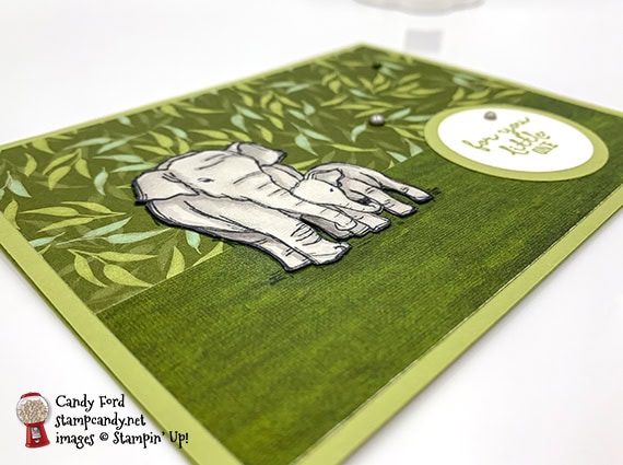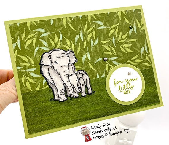 I especially love the elephants. I learned a lot about these magnificent creatures when I visited the Phuket Elephant Sanctuary in Thailand a couple years ago. One of the elephants I saw was using her trunk to pull down bamboo trees – very big bamboo trees. The pattern of Garden Lane Designer Series Paper I used for the background on this card reminds me of bamboo leaves. It looks like mommy and baby are nuzzling in a cozy bamboo forest. So sweet!