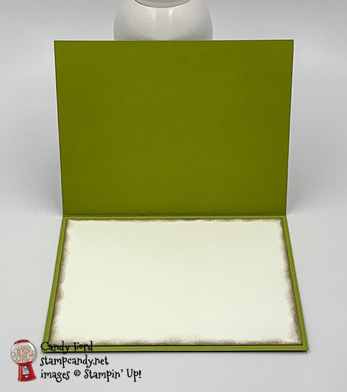 - Pear Pizzazz card stock (CS) cut to 5-1/2″ x 8-1/2″, then scored in half at 4-1/4″