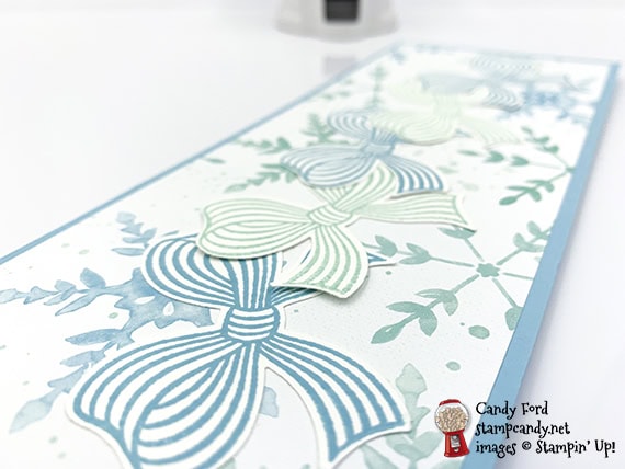 - 3 bows in Balmy Blue ink and 2 bows in Pool Party ink onto a scrap of Whisper White Thick CS