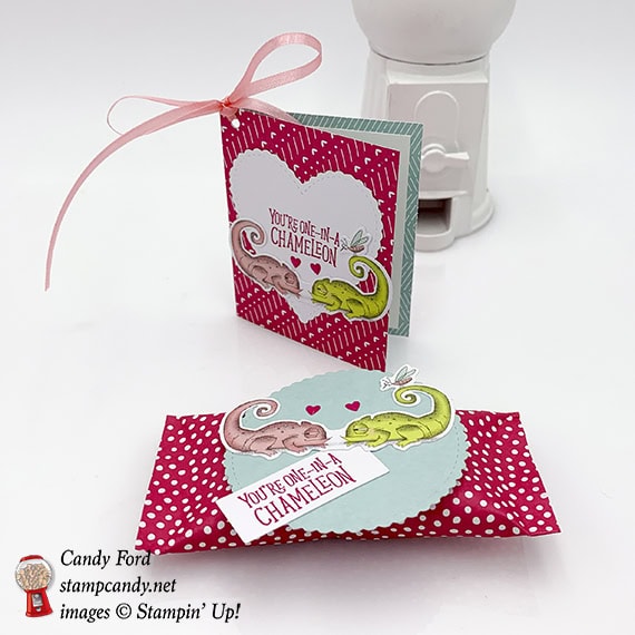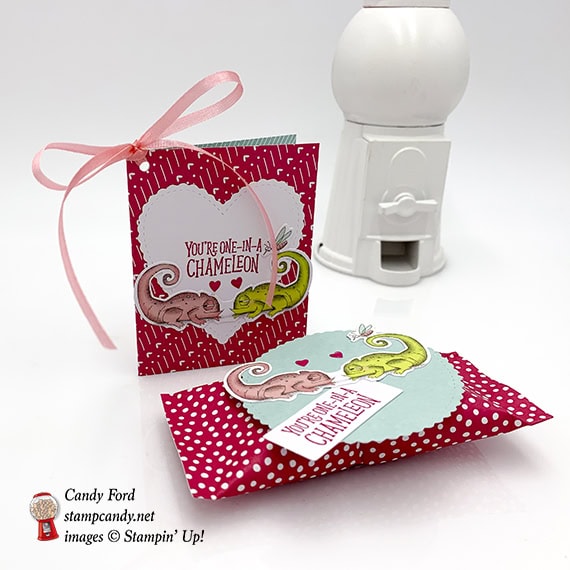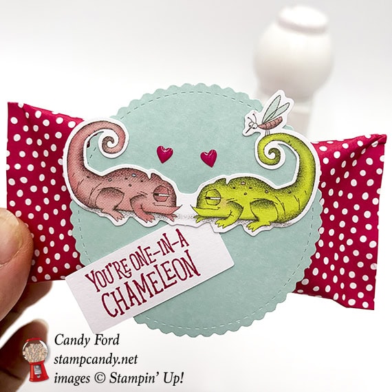 It’s time for the APPT Blog Hop for the January 2019 Be Mine Paper Pumpkin kit! I have really enjoyed playing with this month’s kit. First, it’s adorable and fun. Second, it comes with a lot of extra pieces. Third, since it coordinates with the Animal Expedition suite from the Annual catalog, you can do lots and lots of different things with it. And fourth, I love puns – “you’re one in a chameleon.” For today’s projects I made a mini card that can be tucked into a 3″ x 3″ envelope or tied onto a gift, and a Ghirardelli treat wrapper. (Target has lots of cute Valentine’s versions of lots of your favorite candies.)