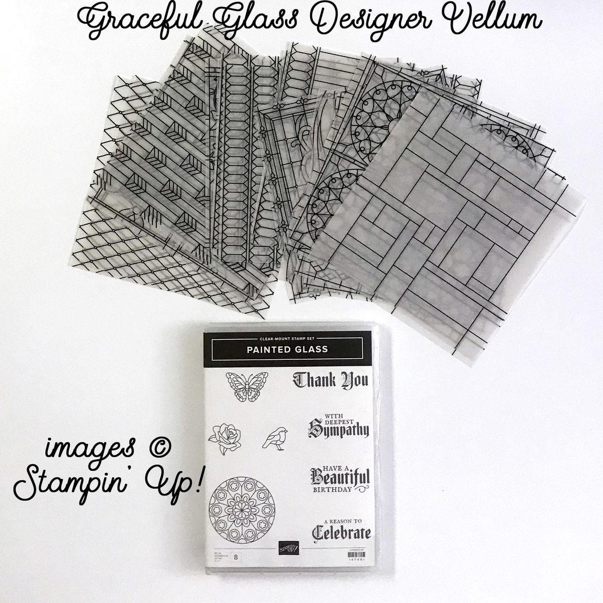 Painted Glass stamp set, Graceful Glass Designer Vellum, Black 1/8″ Cord, Stampin’ Blends Markers in Lovely Lipstick and Pineapple Punch, Lovely Lipstick 8-1/2″ x 11″ card stock, Pineapple Punch 8-1/2″ x 11″ card stock.