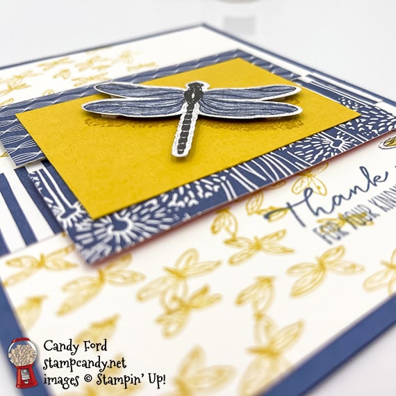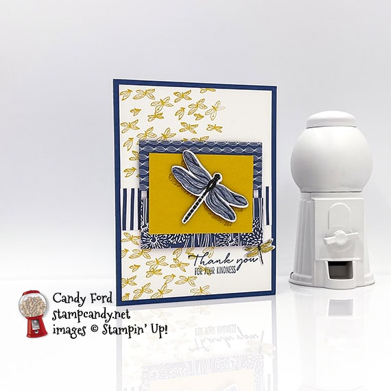 Recently Stampin’ Up! had their convention type event called OnStage, only this time it was virtual, so it was called OnStage@Home. Today I’m sharing one of the cards we made with some items we were able to order early. It’s made with the Dragonfly Garden Bundle (Dragonfly Garden stamp set and Dragonflies Punch) and Dandy Garden Designer Series Paper. They are part of the Dandy Garden Suite Collection that will be in the January-June 2021 Mini Catalog. If you want me to send you a free catalog, request one here.
