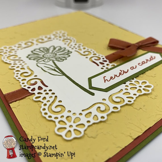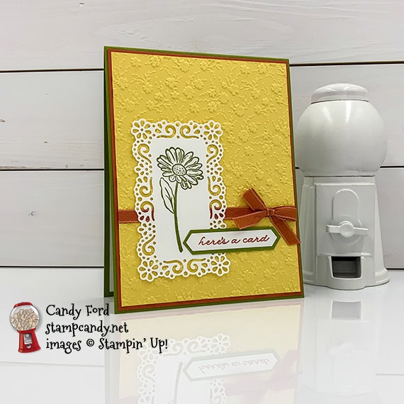 Today I’m sharing the second Make & Take project from our April Candy Hearts team meeting. For this card we used the Ornate Floral 3d Embossing Folder for the background layer. We also used the Ornate Style Bundle, Ornate Thanks stamp set, Ornate Garden Ribbon Combo Pack, and the Classic Label Punch.