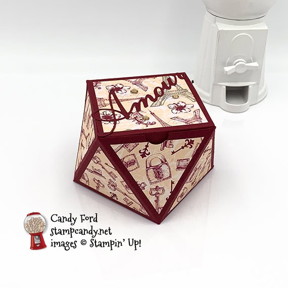 - die cut “Amour” glued onto the DSP square on the lid of the box