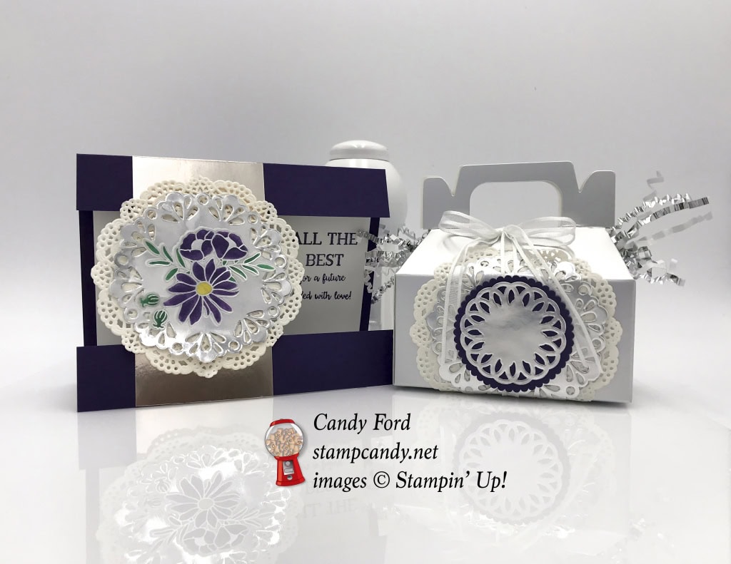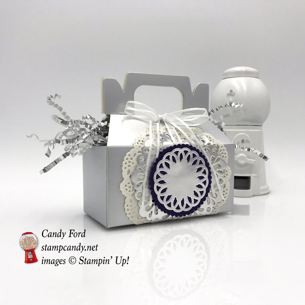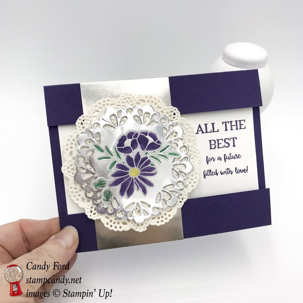 - die cut Elegant Eggplant CS scalloped circle adhered to the silver doily using Stampin’ Dimensionals, careful to leave a “tunnel” for the ribbon to slide through freely