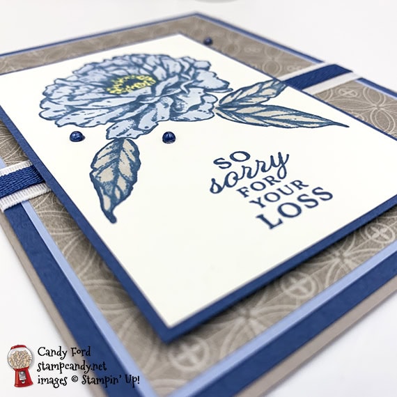For today’s sympathy card I used the Prized Peony stamp set and Peony Garden Designer Series Paper from the Peony Garden Suite. I used two blues (Misty Moonlight and Seaside Spray) along with Gray Granite and Whisper White. I colored some Pearl Basic Jewels with a Misty Moonlight Stampin’ Blends Marker; and I colored the stamped image in Seaside Spray, So Saffron, and Gray Granite. The white ribbon is from the Flowers for Every Season Ribbon Combo Pack, and the blue ribbon is Misty Moonlight 1/4″ twill ribbon.