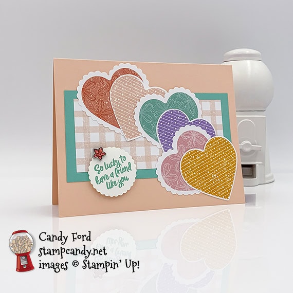 Today I’m sharing a card I made using some of the new Coordination Products. The Pleased As Punch Designer Series Paper (DSP) coordinates with the Heart Punch Pack, as well as three other punches. For today’s card I used the Heart Punch Pack and DSP along with the Heartfelt stamp set to create a friend card.