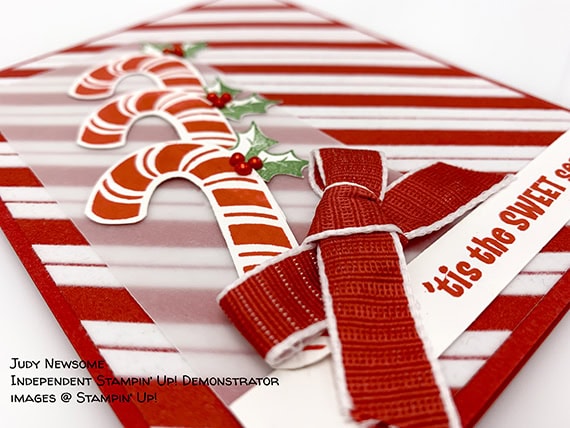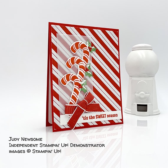Today I’m sharing a wonderful Christmas card made by Judy Newsome, one of my Candy Hearts team members. She used the Candy Cane Season bundle to create this trio of Poppy Parade candy canes on a vellum background over a layer of Santa’s Workshop Designer Series Paper.