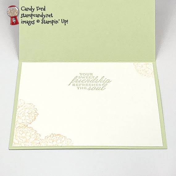 Today I’m sharing one of this month’s Stamp Club cards. I used the Prized Peony bundle (Prized Peony stamp set and Peony Dies,) Peony Garden Designer Series Paper, Square Vellum Doilies, and Elegant Faceted Gems. When I first saw the Peony Dies, I thought it must be complicated to assemble the pieces into a flower. Holy cow, was I ever wrong! The flower has four pieces. Each piece has a slit that you slip the next smaller piece into, and they all line up at the bottom. It couldn’t be easier. And what a spectacular result!