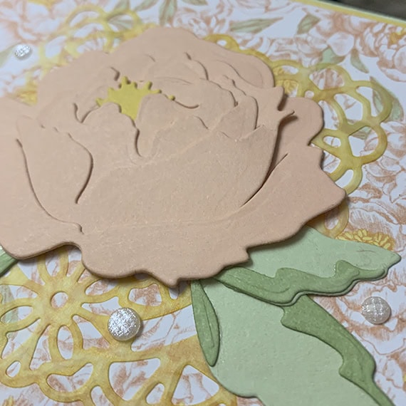 - flower and leaves adhered onto the DSP layer, over the doily, using Stampin’ Seal