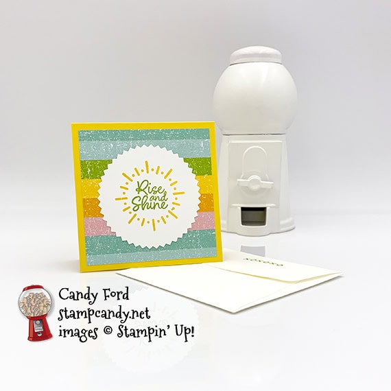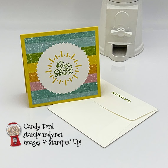 Stampin’ Up! will release a second batch of Sale-A-Bration items on March 3! Today I’m sharing a sneak peek of the Rise & Shine stamp set, which is one of those 2nd Release items. I’ve used it to make a mini card and envelope.