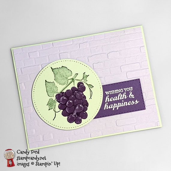 Today I’m sharing another card I made using the Slice of Happiness stamp set. You can see the first one here. I used the grapes on this one. I stamped them in two colors and combined them for a two-tone image. For the background I used the Brick & Mortar 3D embossing folder, and I cut the stamped images using the Stitched Shapes Dies and the Stitched Rectangle Dies. I thought the grapes were appropriate for the sentiment, Wishing You Health and Happiness.