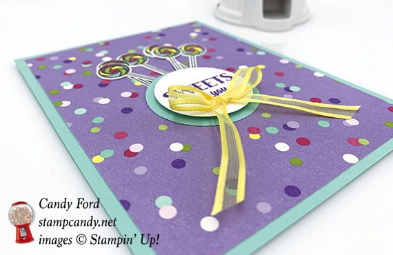 I have been playing with the How Sweet It Is suite of products a lot lately, and why not? It’s adorable and fun. The colors are bright and cheerful. I used it to made today’s card with confetti dots and lollipops that says Sweets for You. I used a piece of the Organdy Ribbon Combo pack that has now sold out. If you didn’t get it in time, you can easily replace it with one of the many other ribbons we have. I would suggest the Pineapple Punch 1/4″ Grosgrain Ribbon.