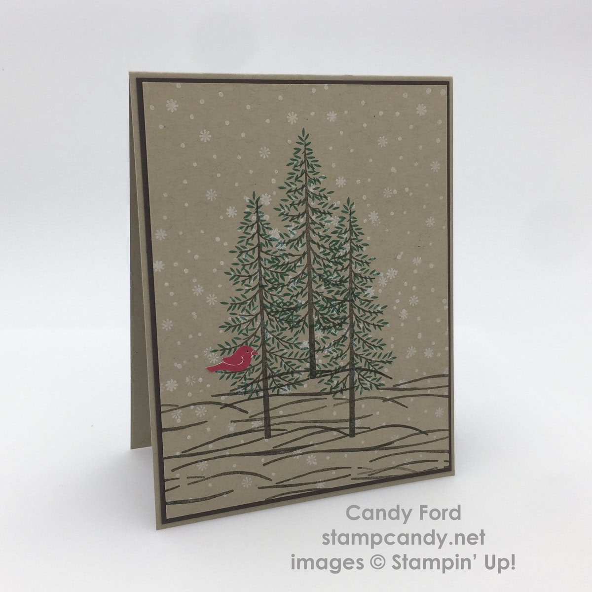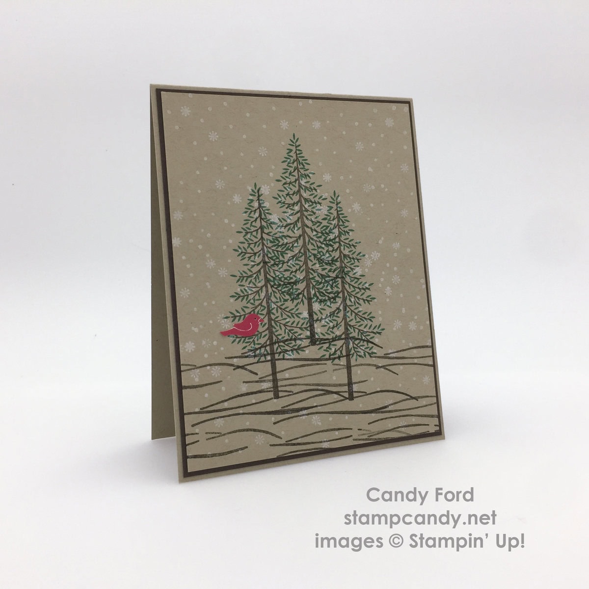 On the top layer, I stamped the ground and the tree trunks in Early Espresso ink. I stamped the evergreen bits of the trees in Emerald Envy ink.