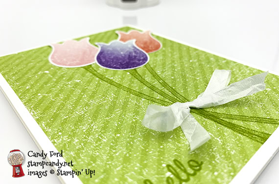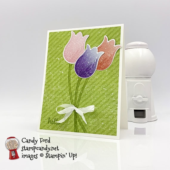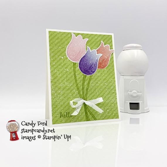 I used the Timeless Tulips Bundle (Timeless Tulips stamp set and Tulip Builder Punch) along with the Pleased As Punch Designer Series Paper to create today’s Hello card. The colors in this paper just scream Springtime.