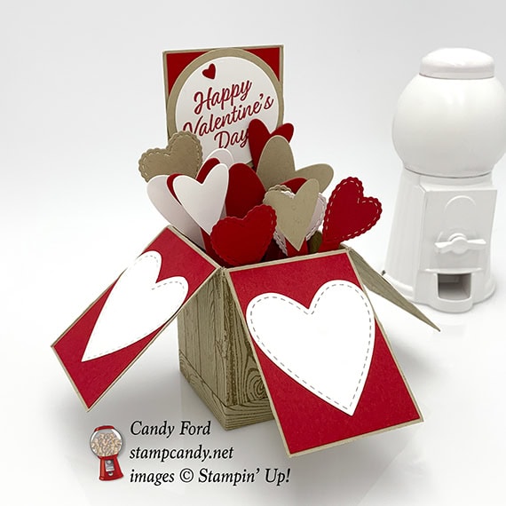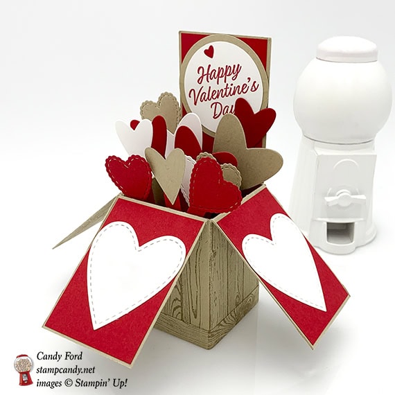 I know it’s a day past, but I have one more Valentine to share with you. It’s the one I made for my sweet hubby. It’s a card that becomes a box with hearts exploding out of it. The Hardwood background stamp creates the wooden box, and the Meant to Be and Forever Lovely stamp sets provide the sentiments. All the hearts are cut using the Be Mine Framelits Dies (available bundled with the Meant to Be stamp set to save 10%.) The front sentiment is cut out using Circle Punches.
