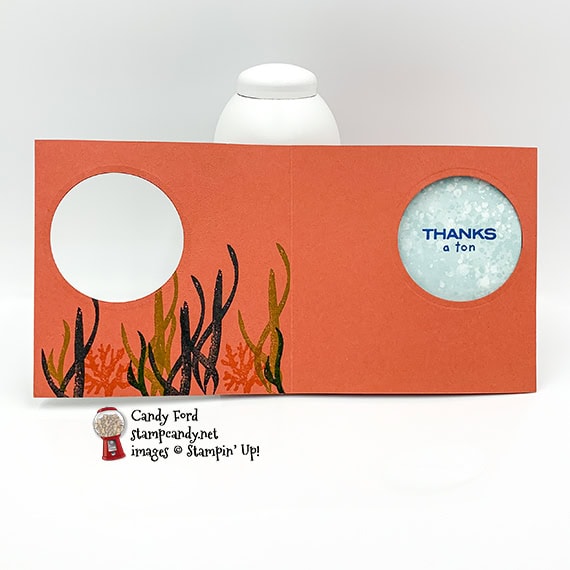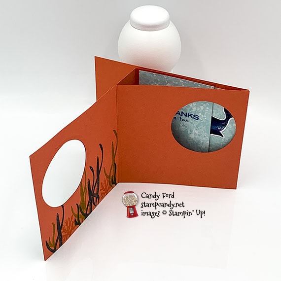 Today I’m sharing a peekaboo card I made with products from the Whale of a Time Suite. When the card is closed, you see a whale peeking through a round window. When you open it, the whale disappears and the sentiment is in the window. I was surprised at how easy this was to put together. To me, the hardest part about a peekaboo card is getting the round holes to line up just right. I used the Whale Done Bundle (Whale Done stamp set and Whale Builder Punch) and Whale of a Time Designer Series Paper.