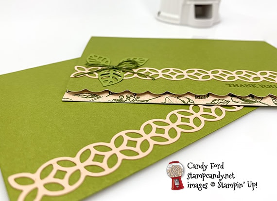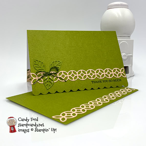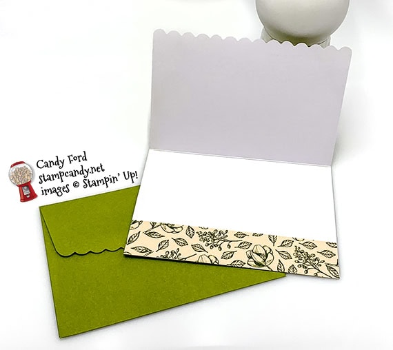 Need a pretty card in a hurry? It’s so easy to create a pretty card when you start with the Scalloped Note Cards & Envelopes. They’re pretty in themselves, so you can add a minimum of extras and be out the door to your event in no time. For today’s card I used the Woven Heirlooms stamp set, Flourish Dies, and Magnolia Lane Designer Series Paper to decorate an Old Olive note card and envelope.