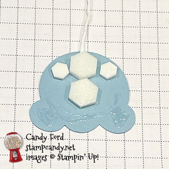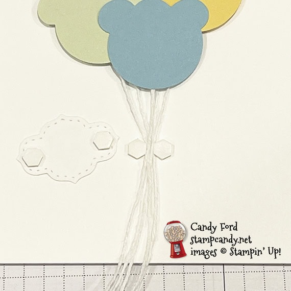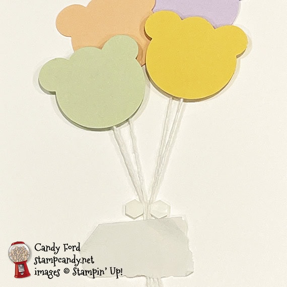 2 more balloons adhered beneath the first ones using Stampin’ Dimensionals, and the strings added to the first ones