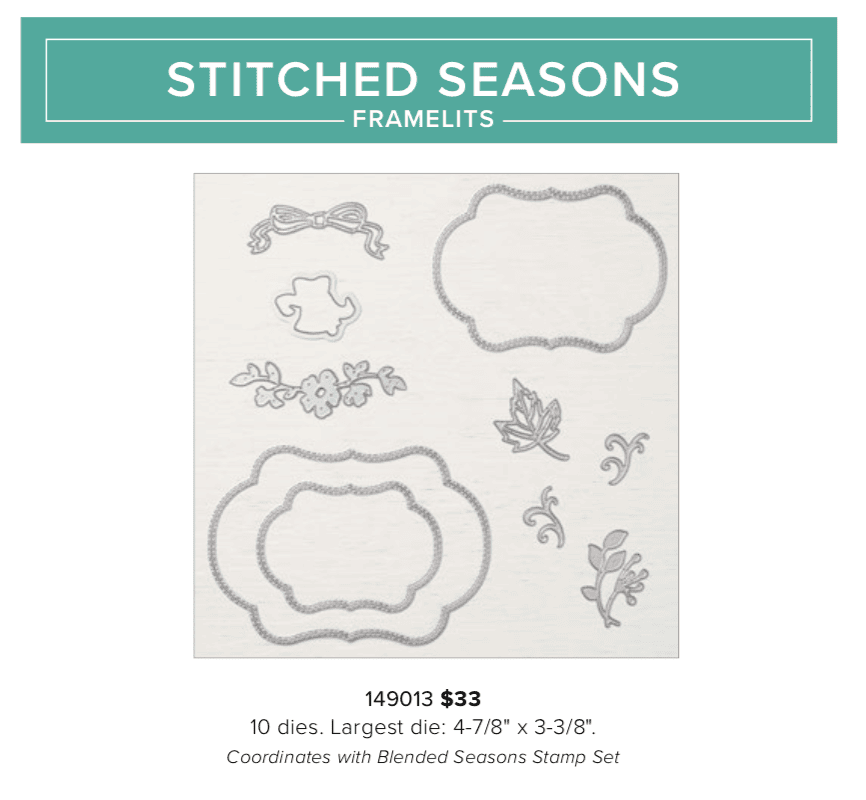 Stitched Season Framelits Dies, a coordinating stitched die that includes stitching on both the positive and negative images! #149013 @ $33. Has10 dies. Largest die: 4-7/8″ x 3-3/8″.
