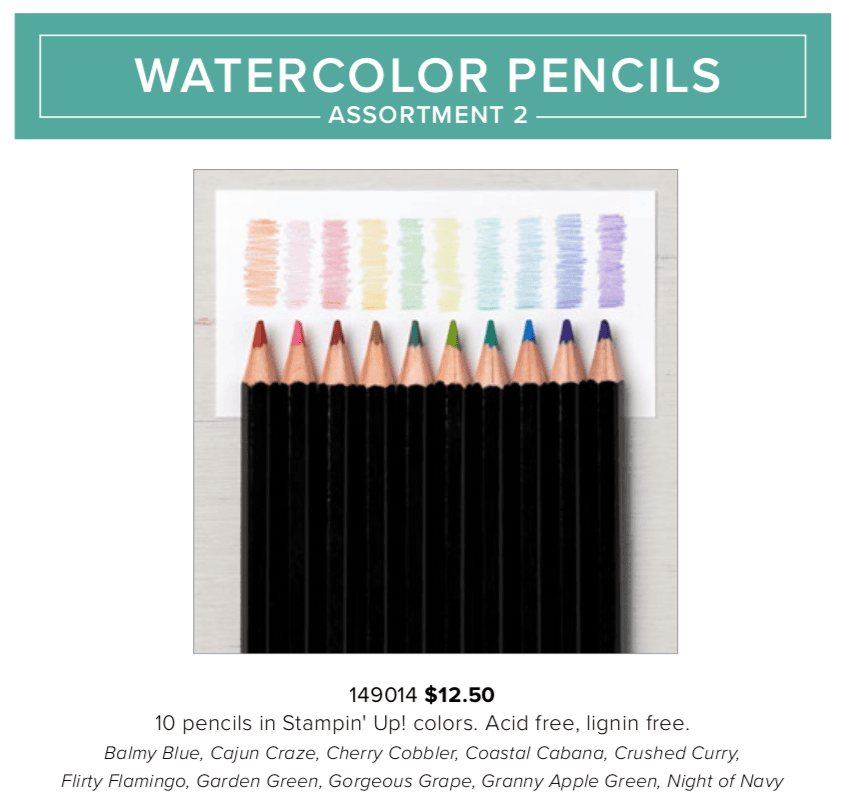 Watercolor Pencils in 10 new colors! #149014 @ $12.50. Acid free, lignin free.10 pencils in Stampin’ Up! colors: Balmy Blue, Cajun Craze, Cherry Cobbler, Coastal Cabana, Crushed Curry, Flirty Flamingo, Garden Green, Gorgeous Grape, Granny Apple Green, Night of Navy