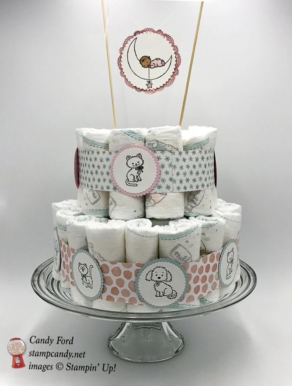 I recently made my very first diaper cake. I know, I know, they’ve been ubiquitous at baby showers for years now, but somehow I just never got around to making one. Until now. It was surprisingly easy. The hardest part was getting all those diapers bundled together without them going every which way. It helps to have an extra pair of hands for that step. Otherwise it was a piece of cake. <wink> I used the Moon Baby stamp set as well and the Pretty Kitty and Bella & Friends stamp sets, and the Whole Lot of Lovely Designer Series Paper (DSP.) I used Powder Pink and Pool Party to create a gender neutral cake, for times when you don’t know the baby’s gender, or for when you know there are a boy AND a girl.