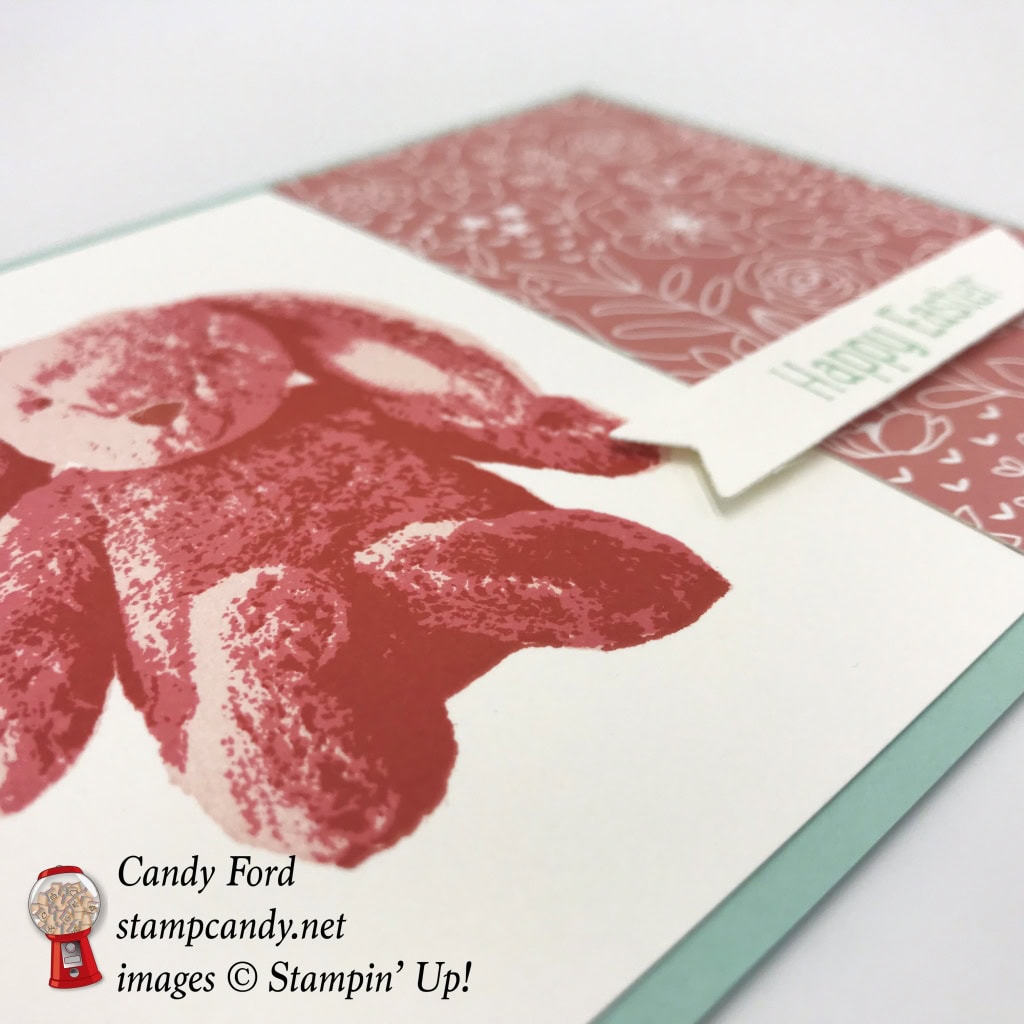 Today I’m sharing a card I made for the Candy Hearts team meeting monthly swap for February. The theme was Spring, including any Spring holiday or anything “Springy.” I used the Sweet Little Something stamp set to create the three stamp photorealistic image of the stuffed bunny. My new Stamparatus made it so so easy to make multiples of this card, all of them lined up perfectly. Just change the sentiment and this card could be used for a baby shower, child birthday, or any occasion calling for a sweet stuffed bunny!