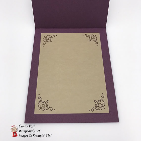 The card base is Fresh Fig card stock, but I used one of the kit card bases to cut a piece for the inside of the card. I used Fresh Fig ink, but the Early Espresso ink that comes in the kit would match equally as well.