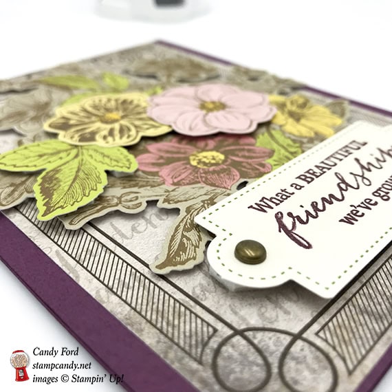 - 2 brads attached to the larger label, then the label adhered to the large floral die cut using Stampin’ Dimensionals