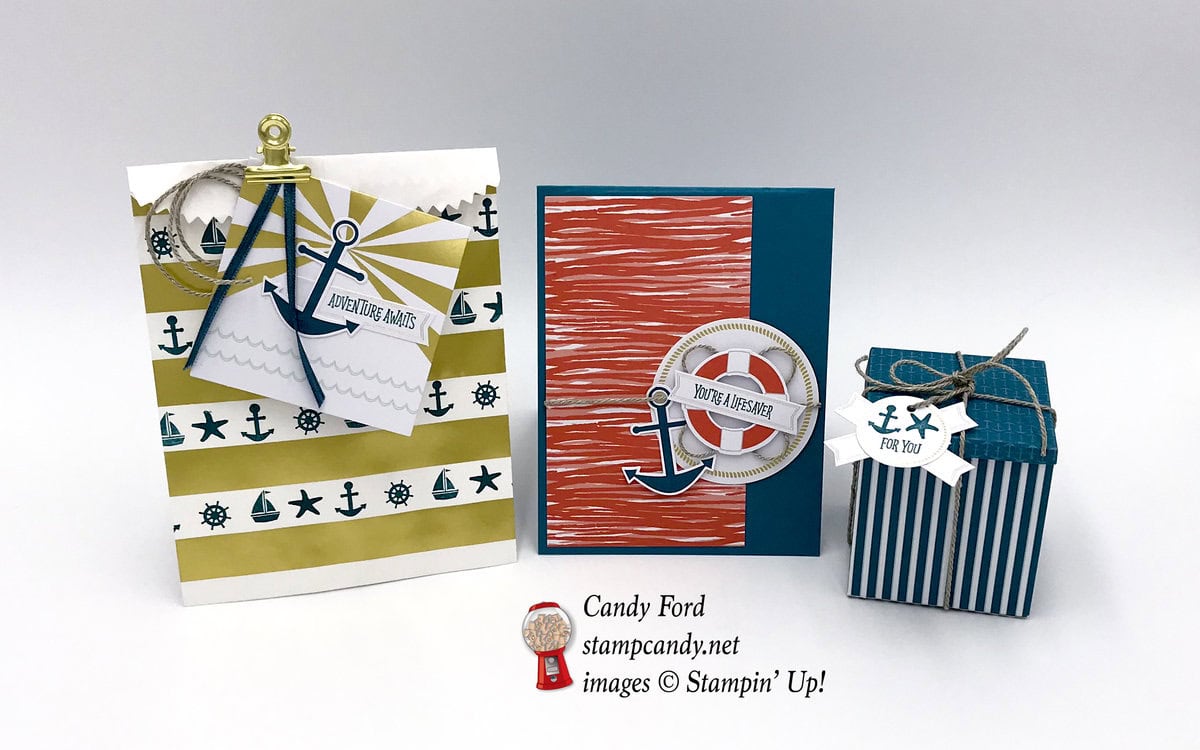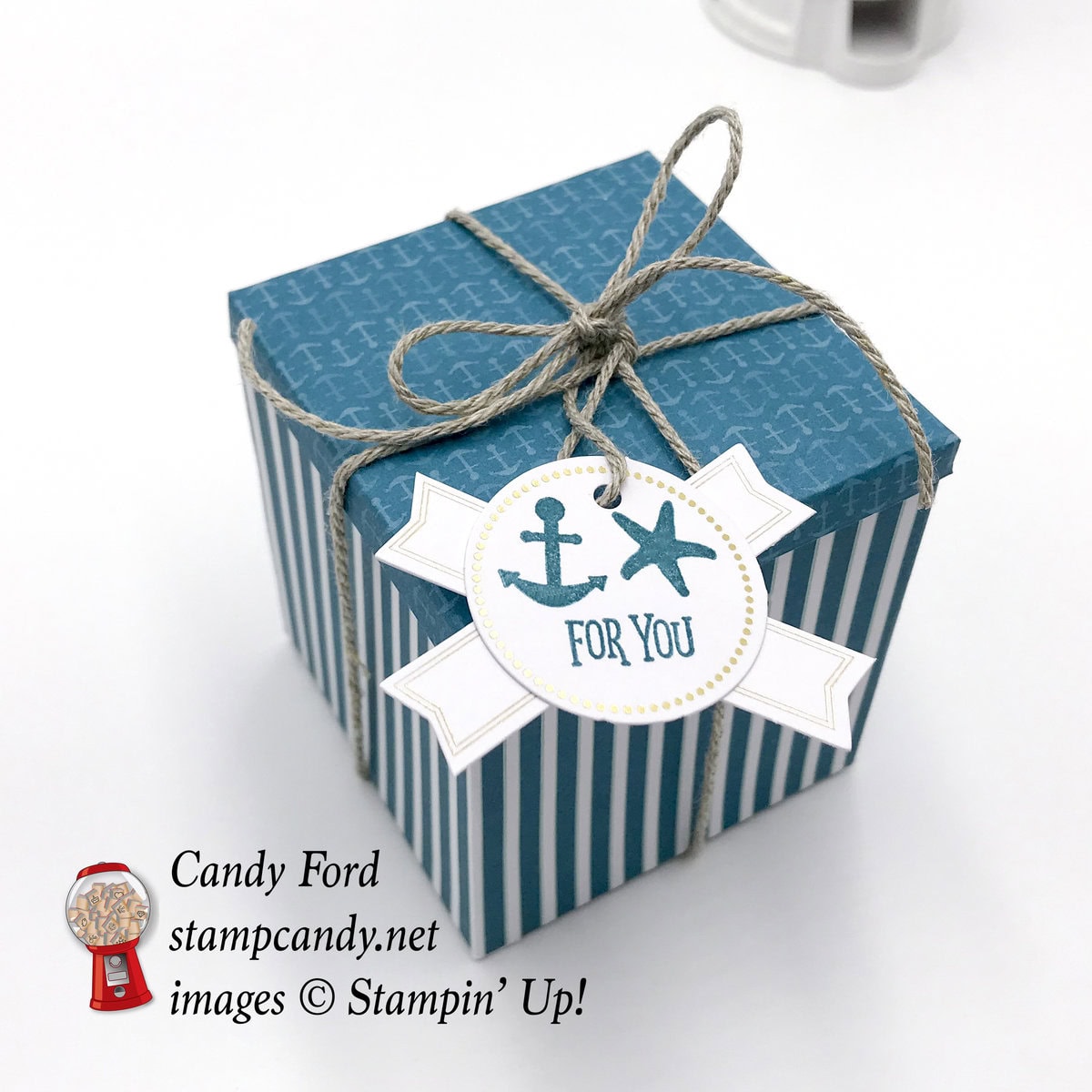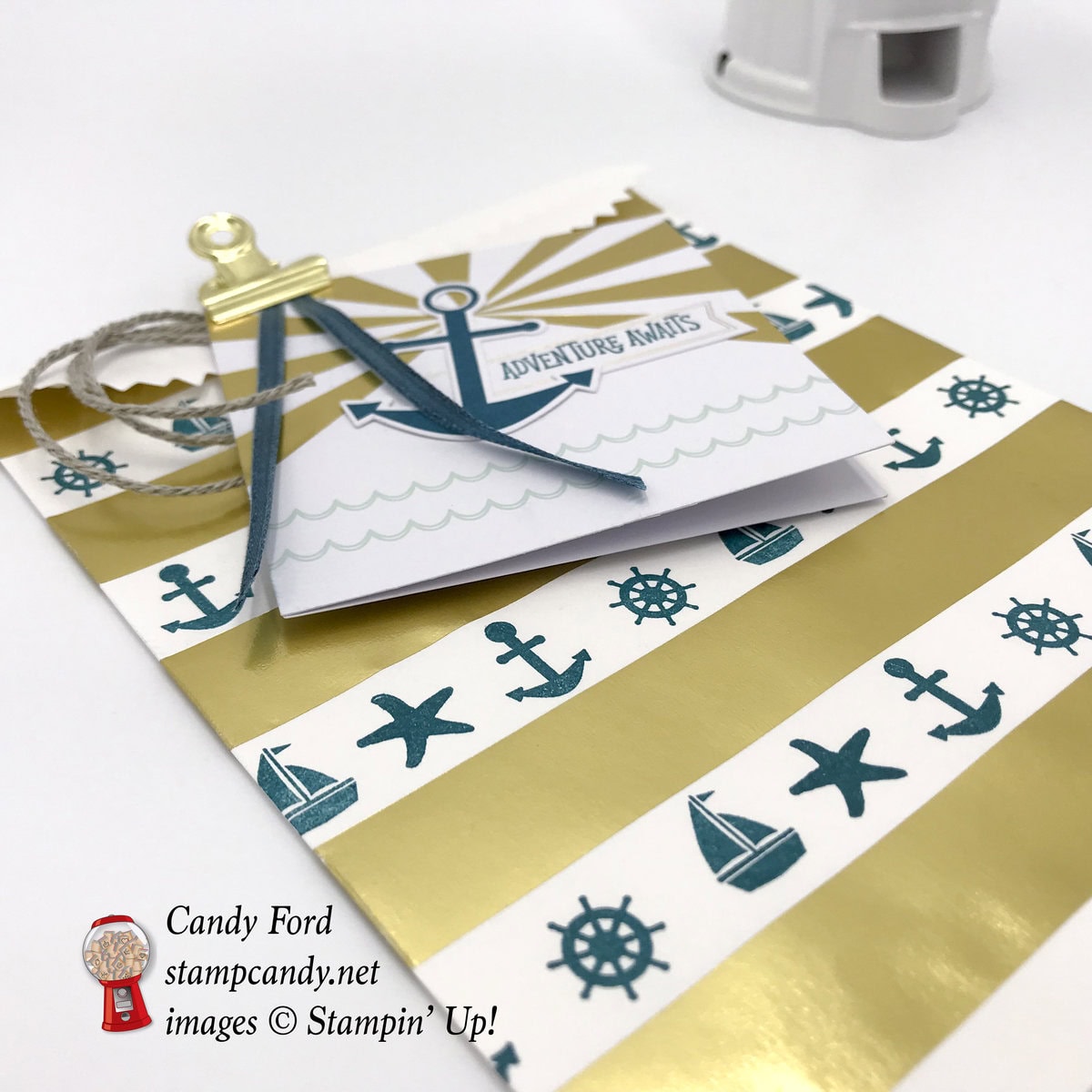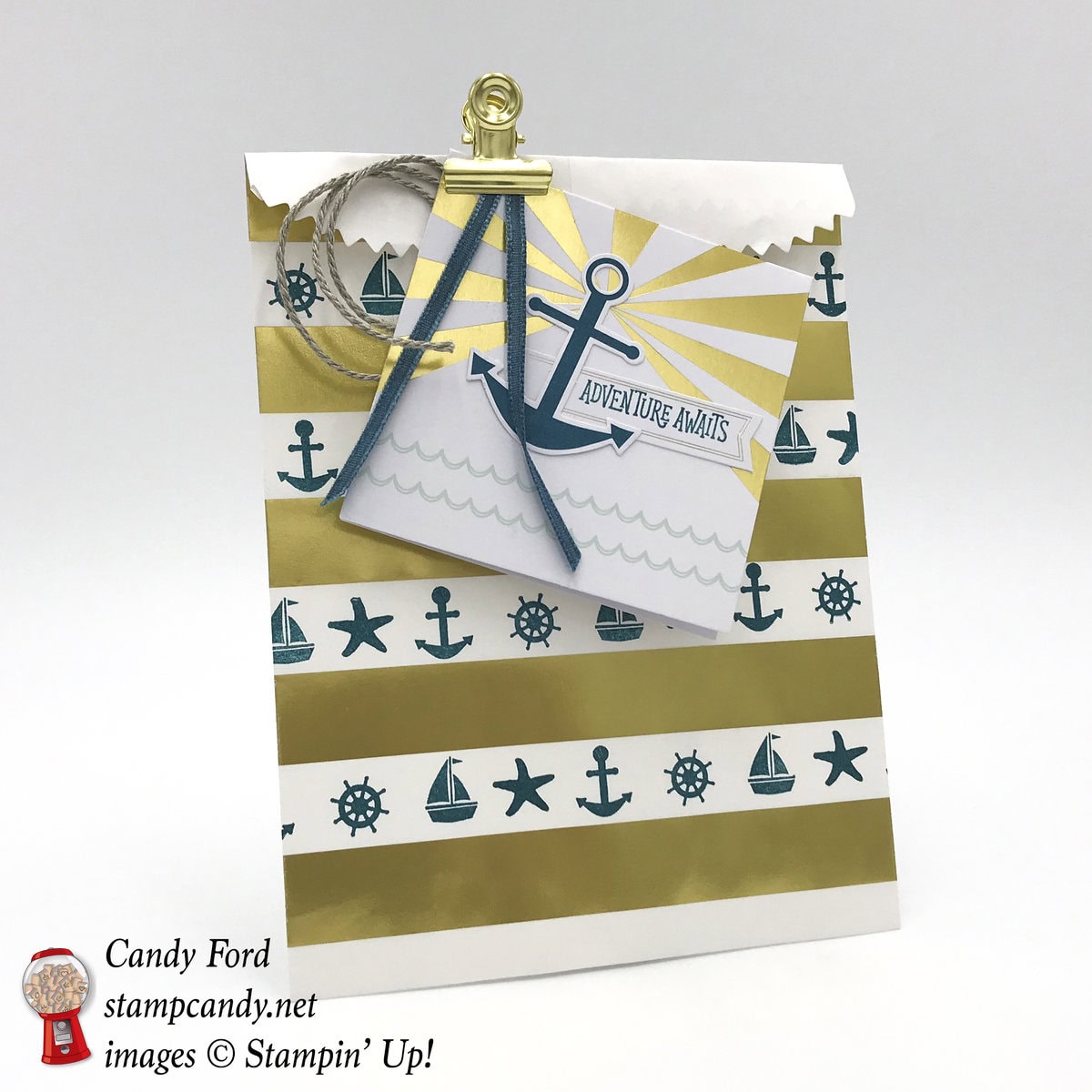 - anchor, wheel, boat, and starfish in Island Indigo ink onto the white stripes of the treat bag – I lined up the four stamps on one acrylic block and stamped them as one long stamp