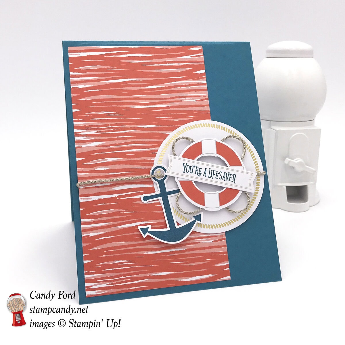 - “You’re a lifesaver” in Island Indigo ink onto one of the small die cut banners