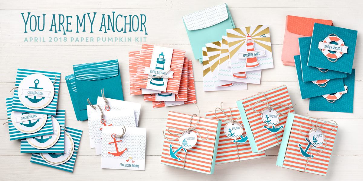 It’s time for the A Paper Pumpkin Thing Blog Hop for the April kit, You Are My Anchor. This is such a fun kit! The colors are great; the images are great; really everything about it is awesome. I’ve had a lot of fun playing with it. I hope you enjoy the alternative projects I’ve made with it. After reading my post, be sure to check out the rest of the stops on the hop. I can’t wait to see what everyone else has made.