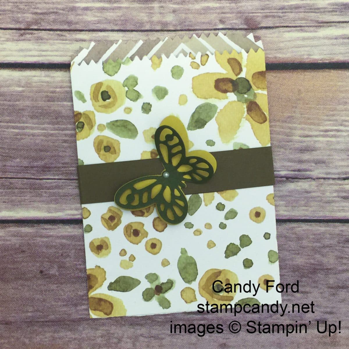 I cut Hello Honey and Mossy Meadow card stock pieces with the Butterfly Thinlits Dies and the Bold Butterfly Framelits Dies, adhered them together, then onto the bag. I added a Pearl Basic Jewel as the head. The bag took all of maybe 5 minutes.