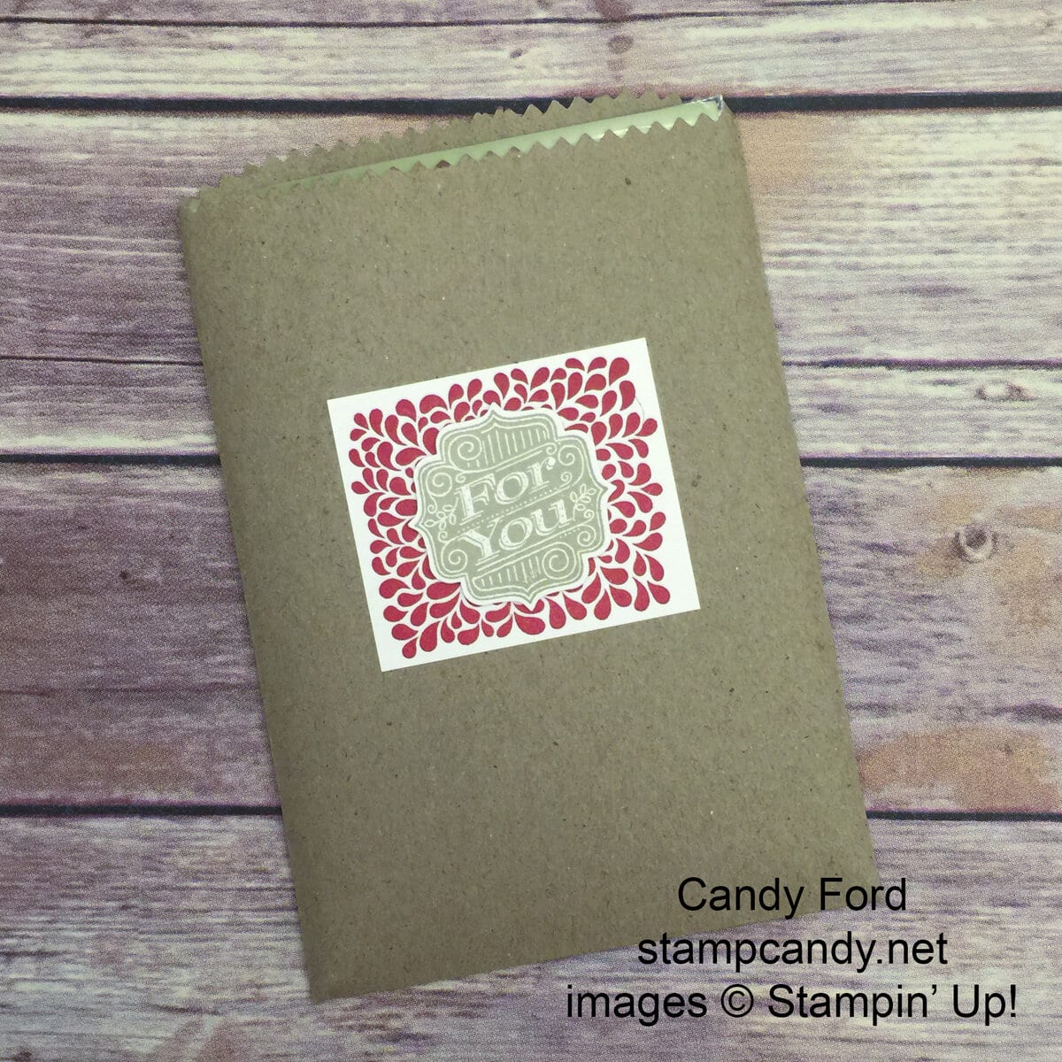 I stamped the sentiment from the Tag Talk stamp set in Crumb Cake onto Whisper White card stock and cut it with the Label Bracket Punch. I attached the sentiment to the red piece with Stampin’ Dimensionals, which I then glued to the bag.