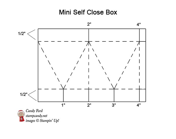 I learned how to make the Mini Self Close Boxes from Hilary Sosebee, who got it from Dani Dziama, who got it from Jana Trautmann. I have no idea who originated the design. If you know, please tell me so I can give them credit. The way the box is scored and folded keeps it closed at the top. You just squeeze the sides in to open it. It will hold 1 or 2 chocolate candies, depending on their size.