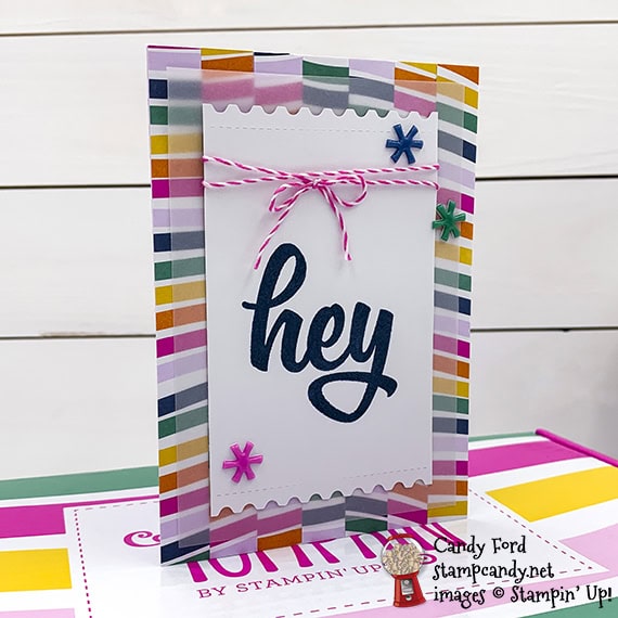 It’s time for the 05-2020 APPT Blog Hop! This month’s kit is called A Kit In Color, and it features some of the new 2020-2022 In Colors. It comes in a fun, colorful box and makes 12 fun, colorful cards. We are featuring alternate projects made with this kit. I made a card and decorated a Mini Pizza Box. Be sure to hop all the way around to see all the great alternate projects!