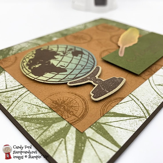 - globe and stand adhered onto the Cinnamon Cider CS layer using Black Stampin’ Dimensionals