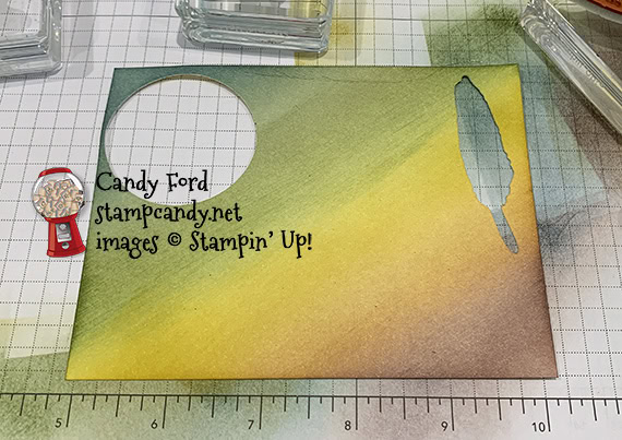 - 2 feathers in Crumb Cake ink onto the yellow/brown area of the blended CS