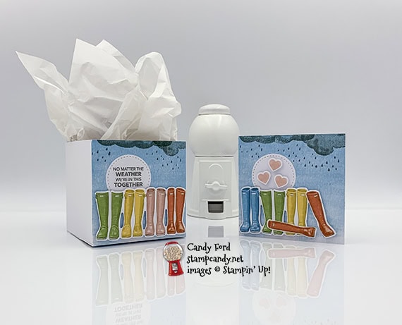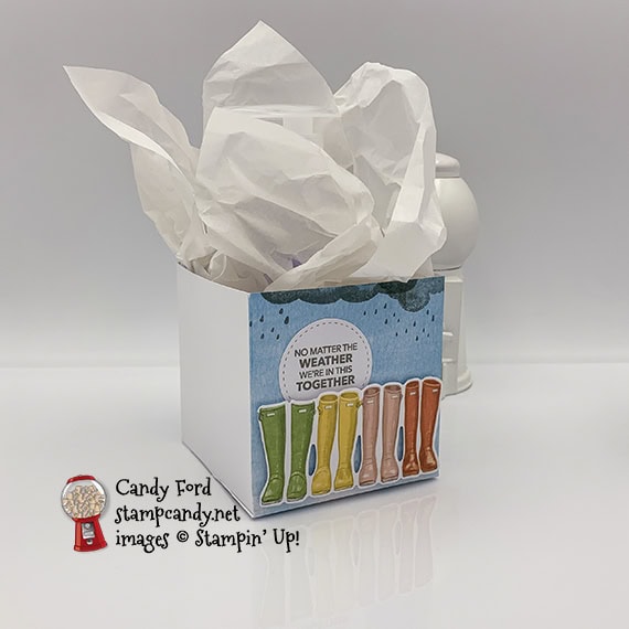 I decided to make a card and an open top gift box for a friend. The current situation in the world makes almost all of us need a little boost. I want my friend to know I’m there for her…with a bottle of hand soap (you can barely see the top of the pump bottle amongst the tissue paper.)