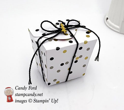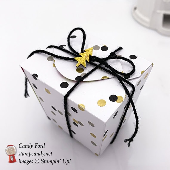 Today I’m sharing a fun little Takeout Treat Box I made for a group of stampers at my retreat last month. I used the Takeout Thinlits Dies to cut the box out of Broadway Bound Specialty Designer Series Paper. I tied a piece of Basic Black Solid Twine around the box, and the finishing touch is a little wooden element I painted with Vegas Gold Shimmer Paint, adhered using a Mini Glue Dot. Easy peasy quick and easy!