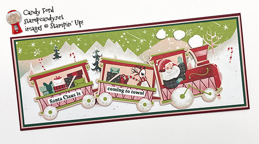 Welcome to the November 2022 ICS Blog Hop! The theme this month is “Christmas is Coming.” I used products from the Santa Express Suite Collection to create a slimline card (3-1/2″ x 8-1/2″ fits in a regular #9 or #10 envelope.) This card is all the the paper. The only stamping is the sentiments. I used the Santa Express Designer Series Paper (DSP) with Cherry Cobbler, Blushing Bride, Shaded Spruce, and Basic White card stocks to create the scene. This DSP makes cardmaking a breeze! And I love that it has Santa and Mrs. Claus in black, white, and brown versions, rather than the more traditional strictly caucasian version. I’m glad that Stampin’ Up! is working on being more inclusive.