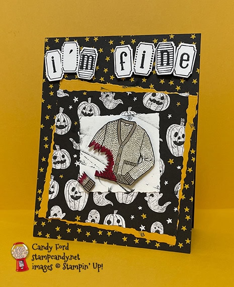 I decided to make my own version with the sweater from the Forever Friendship stamp set. Just FYI, the Dark Cherry Cobbler Stampin’ Blends Marker is great for blood…ya know, just in case you ever need it. I used the black ink pad to grunge up the layers on the front and the inside. The one time I didn’t get an ink smudge on the card, and I wanted to!