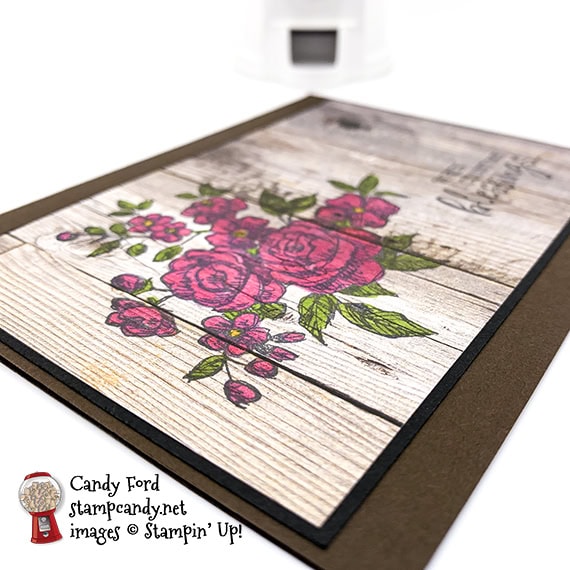 - large floral image and front sentiment in Tuxedo Black Memento ink onto the DSP layer