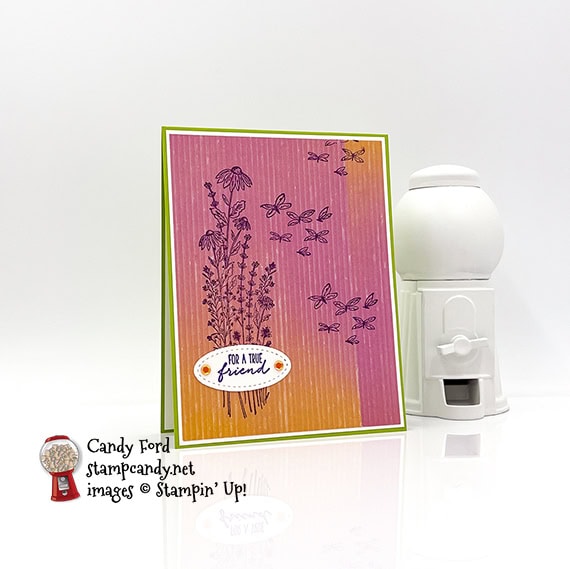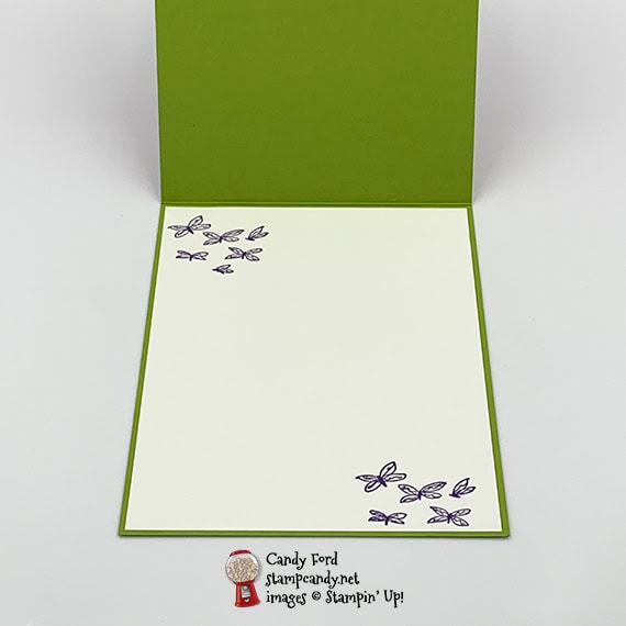 - flowers and dragonflies (or are they butterflies? I’ll just call them critters) in Gorgeous Grape ink onto the DSP layer (after it’s glued onto the Whisper White CS layer)
