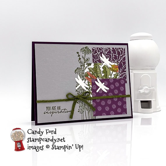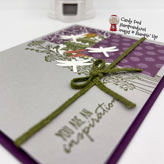 Today I’m sharing another sneak peek of the Dandy Garden Suite Collection – this Inspiration card made with the Dragonfly Garden Bundle (Dragonfly Garden stamp set and Dragonflies Punch,) Dandy Garden Designer Series Paper, and Mossy Meadow Braided Linen Trim. It’s another card that I made during OnStage@Home.