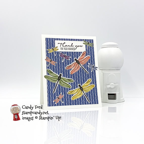 Today’s card features another sneak peek of the Dandy Garden Collection from the upcoming January – June 2021 Mini Catalog. I used the Dragonfly Garden stamp set for the sentiment, and the Dragonfly punch to cut assorted dragonflies from a piece of the Dandy Garden Designer Series Paper.