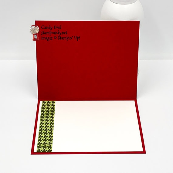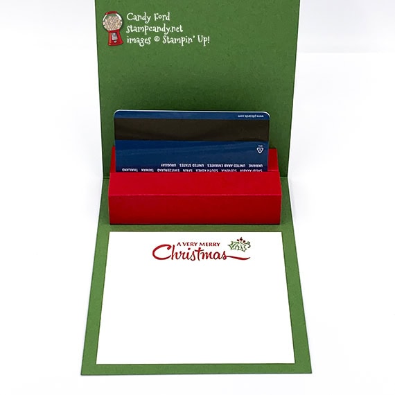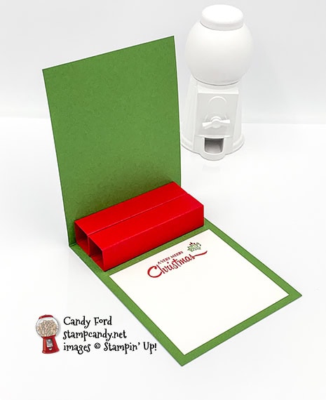 I used the Gift Wrapped Bundle (Gift Wrapped stamp set and Gift Bow Builder Punch) to make today’s project. It’s a Christmas card with a surprise pop-up gift card holder inside. I also used the Label My Fancy punch, Plush Poinsettia Specialty Paper, and Playful Pets Designer Series Paper to create the wrapped gift on the front of the card. This is one of the cards we made in my November Stamp Club gathering. We used the Gift Wrapped bundle to make 3 cards, and I will share the other two here on my blog this week.